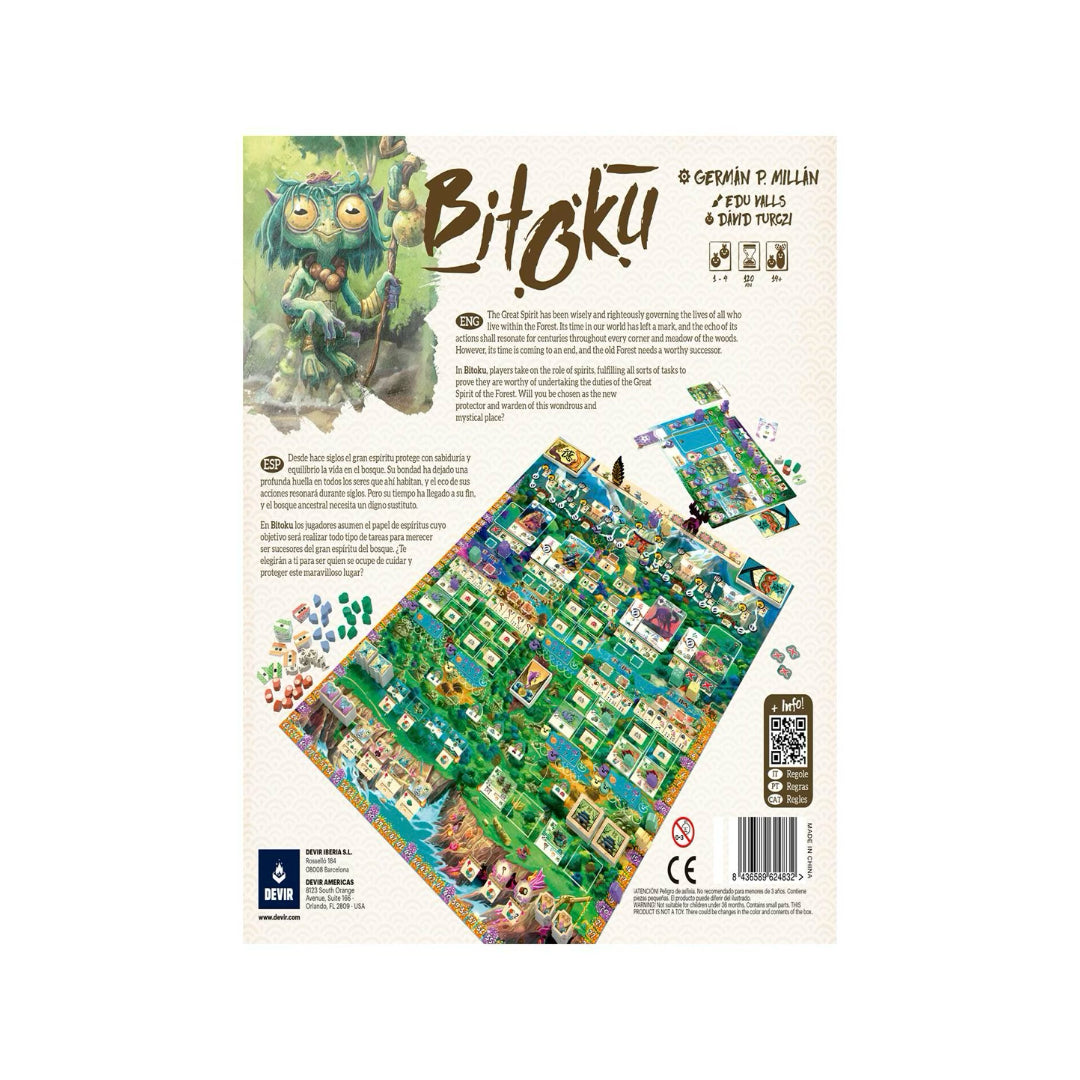 En Bitoku los jugadores tomarán el papel de espíritus que habitan un bosque ancestral guardado por el gran espíritu. Su objetivo será que sus espíritus se eleven con tal de convertirse en dignos herederos del gran espíritu del bosque. Bitoku es un juego de tipo Eurogame de complejidad alta. El gran espíritu del bosque lleva gobernando con sabiduría y justicia la vida de todos aquellos que ahí habitan. Su paso por el mundo ha dejado huella, y el eco de sus acciones resonará durante siglos por todos los confines y rincones del bosque. Pero su tiempo está llegando a su fin. Los espíritus Bitoku del bosque elegirán cuál de ellos ha de ser aquel que le sustituya.
