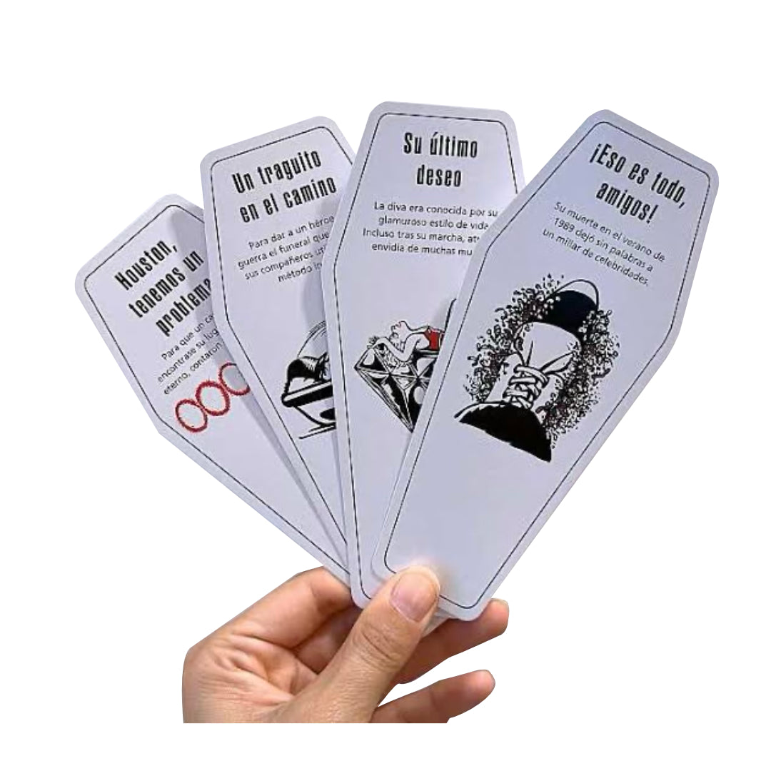 Tener que estirar la pata en algún momento puede ser tan inevitable como desagradable. Pero ¿quién dice que no se le puede sacar partido a la muerte? Hay muchas formas interesantes de celebrar tu funeral: más ecológicas, más caprichosas, más divertidas, más aventureras y también algunoas bantantes ilegales. ¡Al hoyo! comienza donde la mayoría de los Black Stories terminan: ¡con la muerte! Porque aqui se trata de lo que pasa después. ¡Y te aseguramos que es 100% verídico! A quí todos los aficionados a lo macabro y a lo absurdo averiguarán los extraños detalles de los funerales más descabellados de todos los tiempos, ¡haciendo preguntas, adivinando y desvariando!