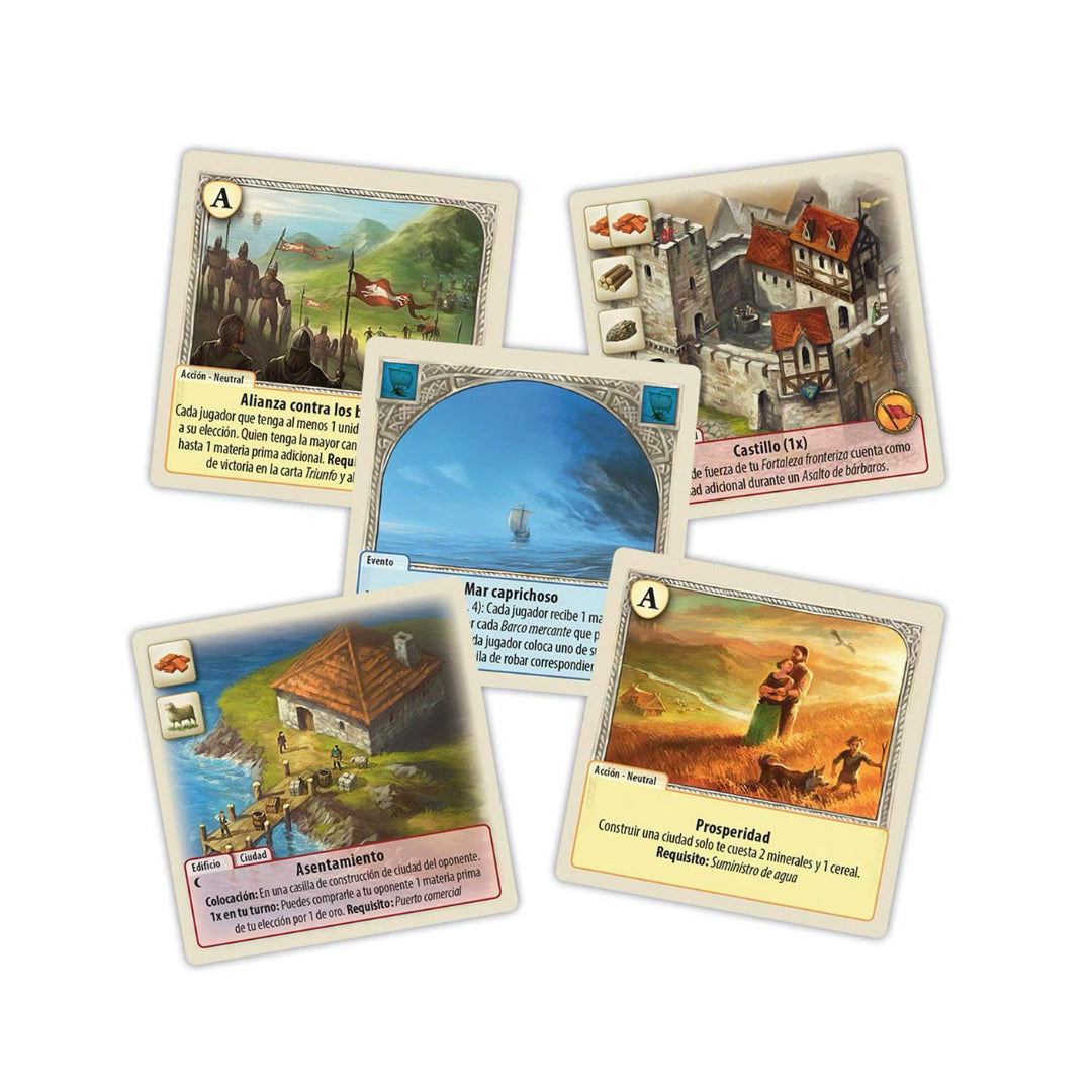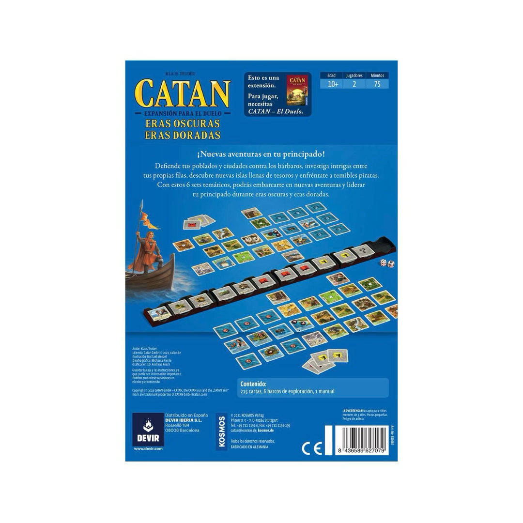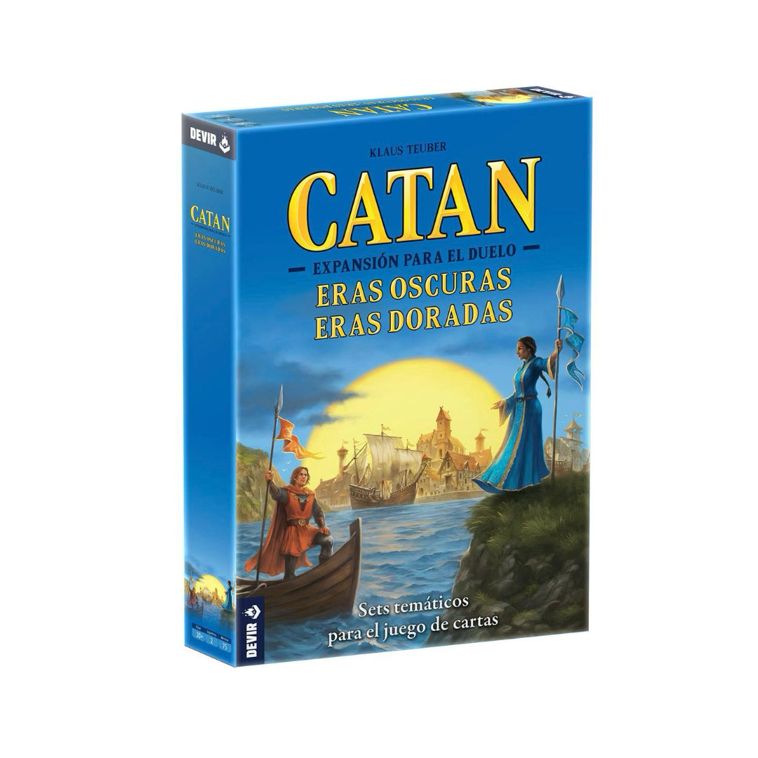Catan: el duelo es la versión creada específicamente para 2 jugadores del mítico Catan. Las reglas y los componentes se adaptan para ofrecer una experiencia de juego en la que desaparece la negociación entre los participantes y se pasa a un sistema de desarrollo de cartas. Eras Oscuras, Eras Doradas añade seis conjuntos temáticos separados que se pueden usar con el juego base. Un total de 215 cartas que se pueden usar por separado o combinadas con los sets que incorporaba el juego base Catan: el duelo.