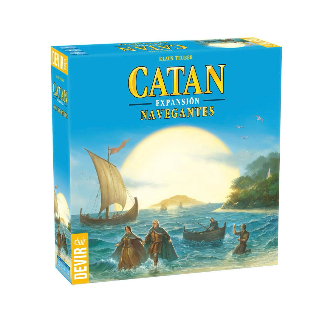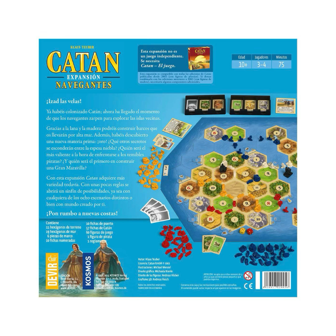Catan Navegantes es la primera expansión en caja grande de Catan. Fue diseñada en 1998 y con ella descubriremos muchas nuevas opciones para nuestras partidas de Catan. Una de las novedades más interesantes de Navegantes de Catan es el hecho de que, a partir de esta expansión, la creación del escenario inicial, que ya era muy diversa en el juego original, se convierte en algo todavía más variado, pues Catan ya no será siempre una sola isla, sino que puede convertirse en todo un archipiélago de pequeñas islas. Para poder movernos entre estas islas y acceder a todos los territorios, dispondremos de otra innovación básica, los barcos.