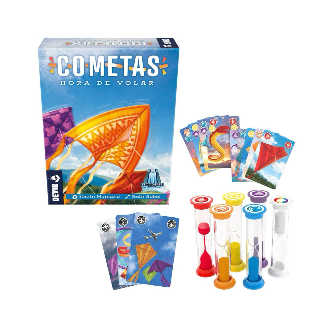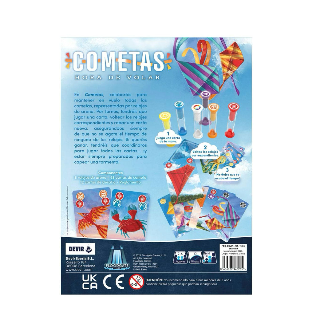 Una vez empieza la partida... ¡No hay marcha atrás! Se pondrán en marcha seis relojes de arena, con lo que no habrá tiempo que perder. El objetivo del grupo será mantenerlos en marcha hasta que se agoten las cartas. En su turno, cada jugador tirará una carta y según el color (o colores) de los símbolos de la parte superior voltearán un reloj u otro. Habrá que estar atentos a los relojes que se agotan más rápido... ¡Pero no siempre os saldrán las cartas que necesitáis! Aunque los turnos sean frenéticos, si queréis que las cometas sigan en el aire, la comunicación será vital.