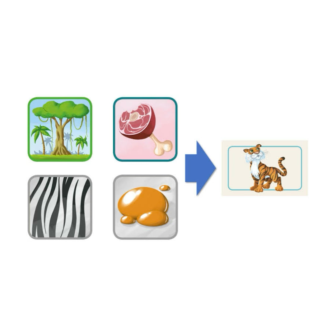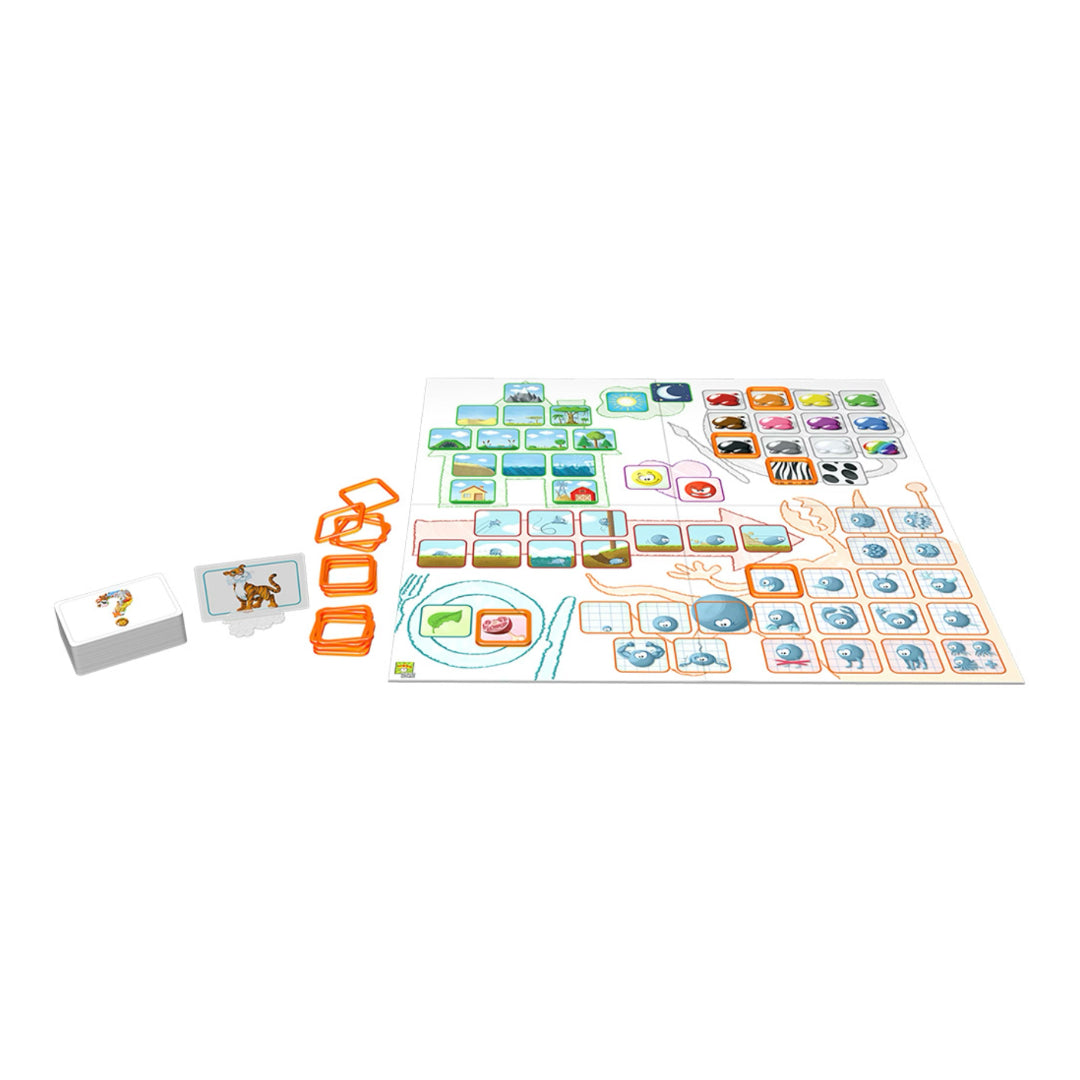 Con Concept Kids ahora todos jugáis juntos y vuestro objetivo es identificar a 12 enigmáticos animales que se esconden detrás de las cartas. En una partida de Concept Kids pueden participar entre cuatro y doce jugadores, de los que se elige a un adivinador que normalmente será quien tenga más edad. El resto tienen que ir describiéndole los animales que van apareciendo en las cartas usando solamente los iconos del tablero. Para comenzar a jugar, colocad la primera carta del mazo en su soporte de manera que el adivinador no pueda verla, ¡y que comience la diversión!