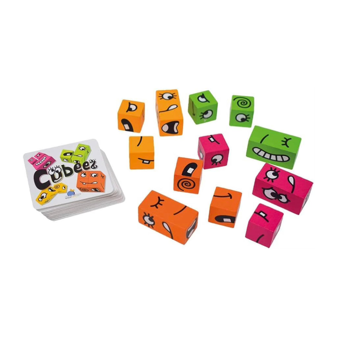 Pon tu cara de juego. Es una carrera para ver quién puede hacer una cara primero. Estará su Cubeez sorprendido, triste, feliz, enojado o un poco de todo? Gire, gire y coloque rápidamente sus 3 cubos para qué coincidan con la cara en la Carta de desafío. Termina primero y viste la cara de un campeón. Los coloridos cubos de madera y los extravagantes desafíos hacen de este juego de velocidad el complemento perfecto para cualquier colección de juegos.