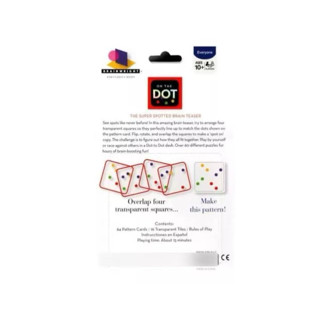 Reta tu mente con este entretenido juego. Cada jugador tiene un conjunto de cuatro micas que pueden rotar, voltear y ordenar para que al sobreponerlas igualen el patrón de puntos que marca uno de los 64 retos. El primer jugador que iguale el patrón de la tarjeta, se la ganará. Al final del juego quien obtenga más tarjetas será el ganador.