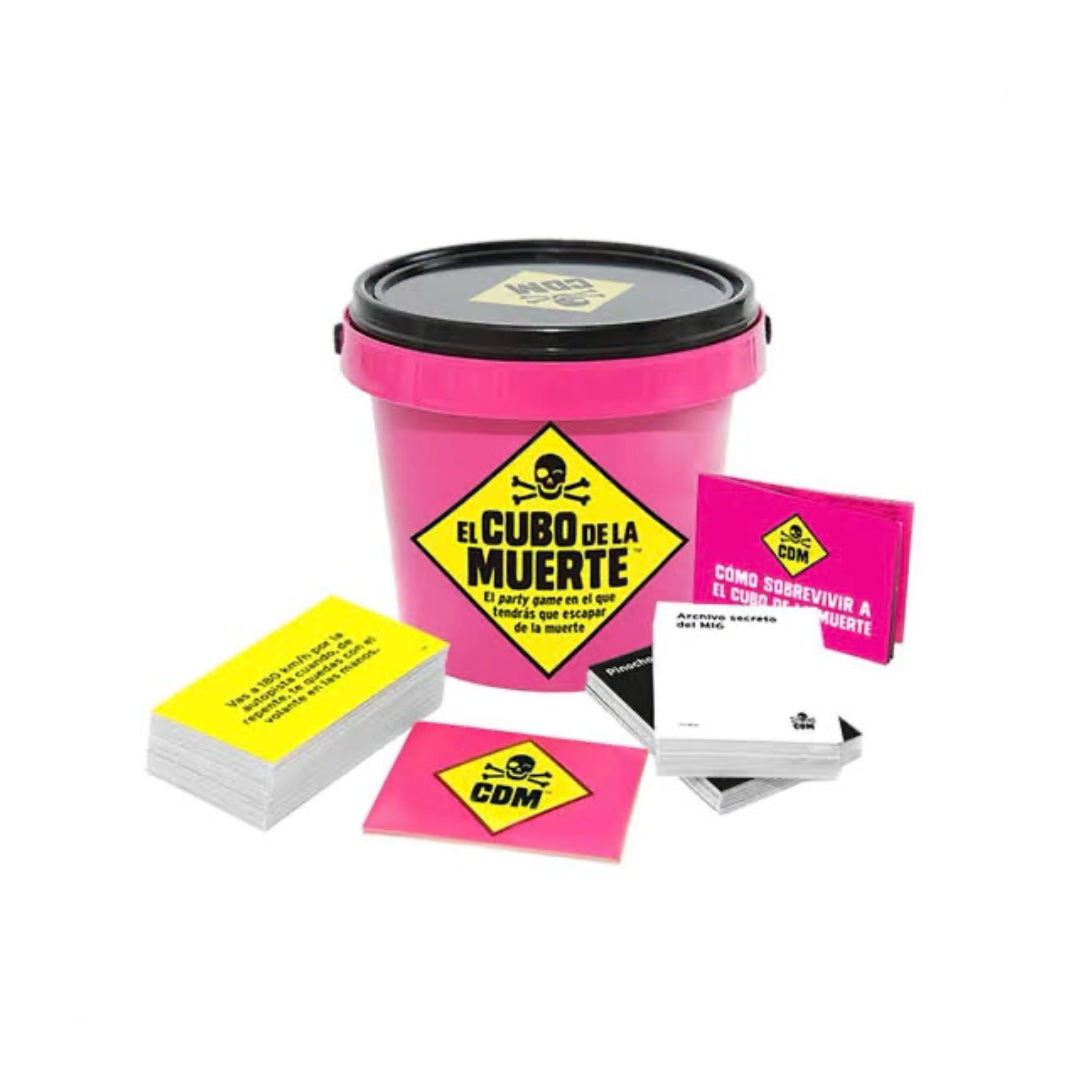 Eres la última persona que queda en el Titanic cuando se parte en dos. Para salvarte tienes una liga con un clip. ¿Qué haces? En la Cubeta de la Muerte (sí, aquí le decimos cubeta) tendrás que ingeniártelas para sobrevivir a situaciones inverosímiles con objetos improbables. Los jugadores elegirán la historia más divertida y más ingeniosa, señalando al jugador con el codo y no con el dedo, porque es de mala educación, aunque, ciertamente, en México eso podría arruinar una noche de juegos. Inventa tus propias situaciones: Caminas de noche por las calles de Ecatepec. Dos sujetos de cierta tribu urbana se te acercan sospechosamente. Tienes un bolillo. ¿Cómo sobrevives?