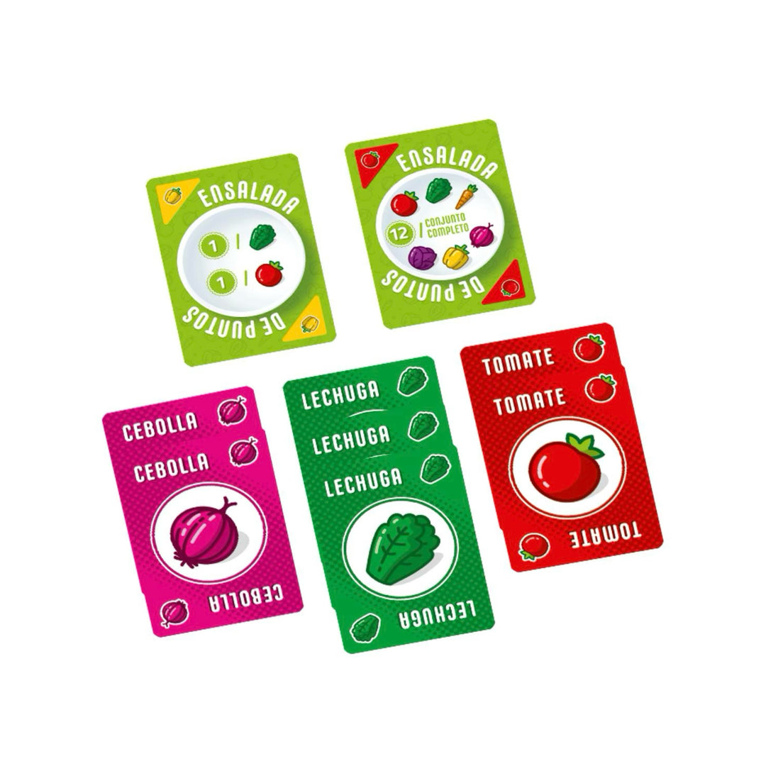 Ensalada de puntos es un juego rápido y divertido en el que hay más de 100 formas diferentes de puntuar. En cada turno los jugadores deberán elegir una carta de verdura sobre el tablero y decidir si la quieren utilizar por la forma de puntuar que aparece en ella o por la verdura que es.