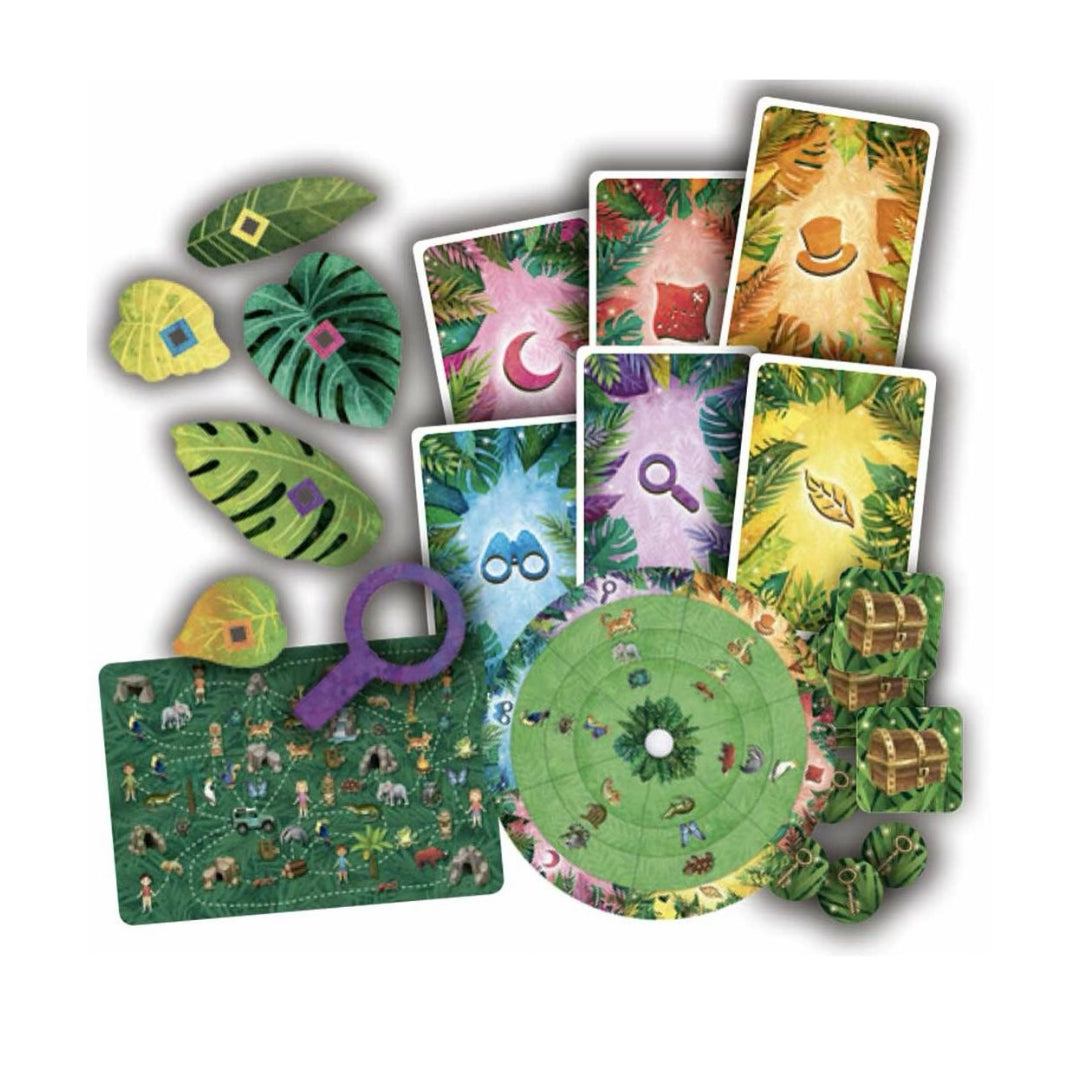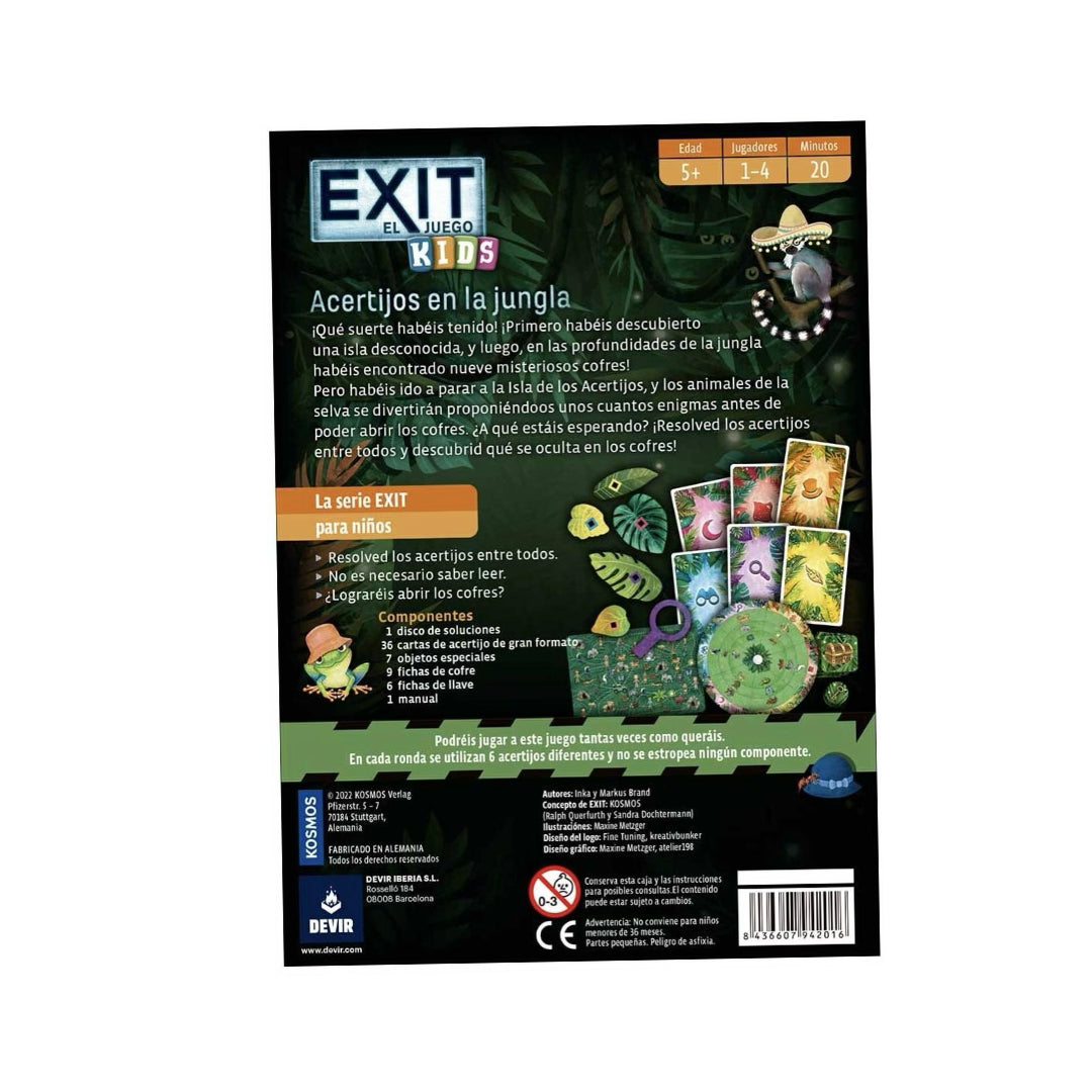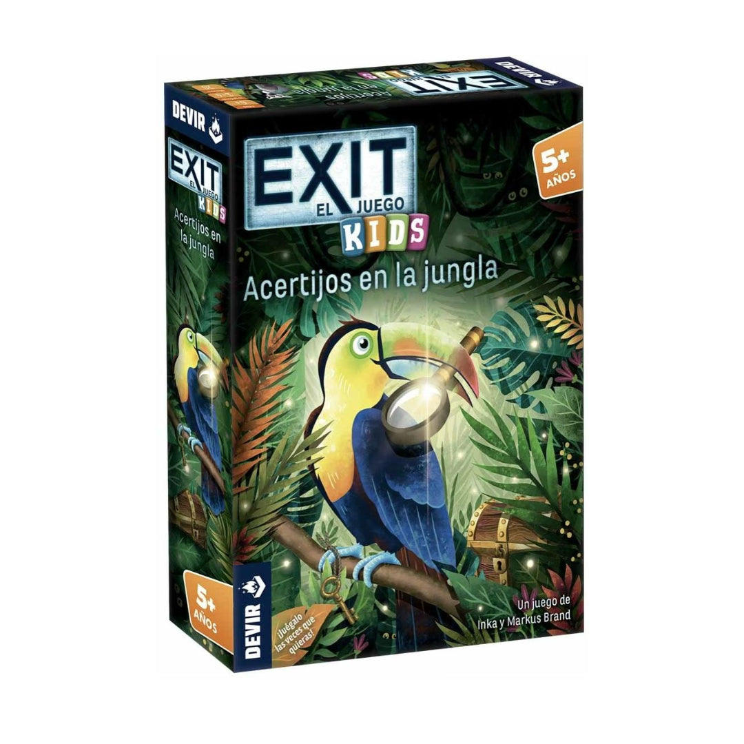 EXIT Kids: Acertijos en la jungla es un juego de escape cooperativo diseñado por Inka y Markus Brand, que se puede disfrutar en solitario o en un grupo de hasta 4 personas, a partir de 5 años, en partidas que pueden durar unos 20 minutos. A través de 36 cartas ilustradas de gran formato, 7 objetos especiales, 9 fichas de cofre, 6 fichas de llave y un disco de soluciones, los jugadores se divertirán resolviendo los acertijos que plantearán los animales de la jungla.