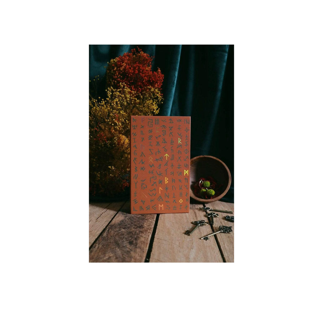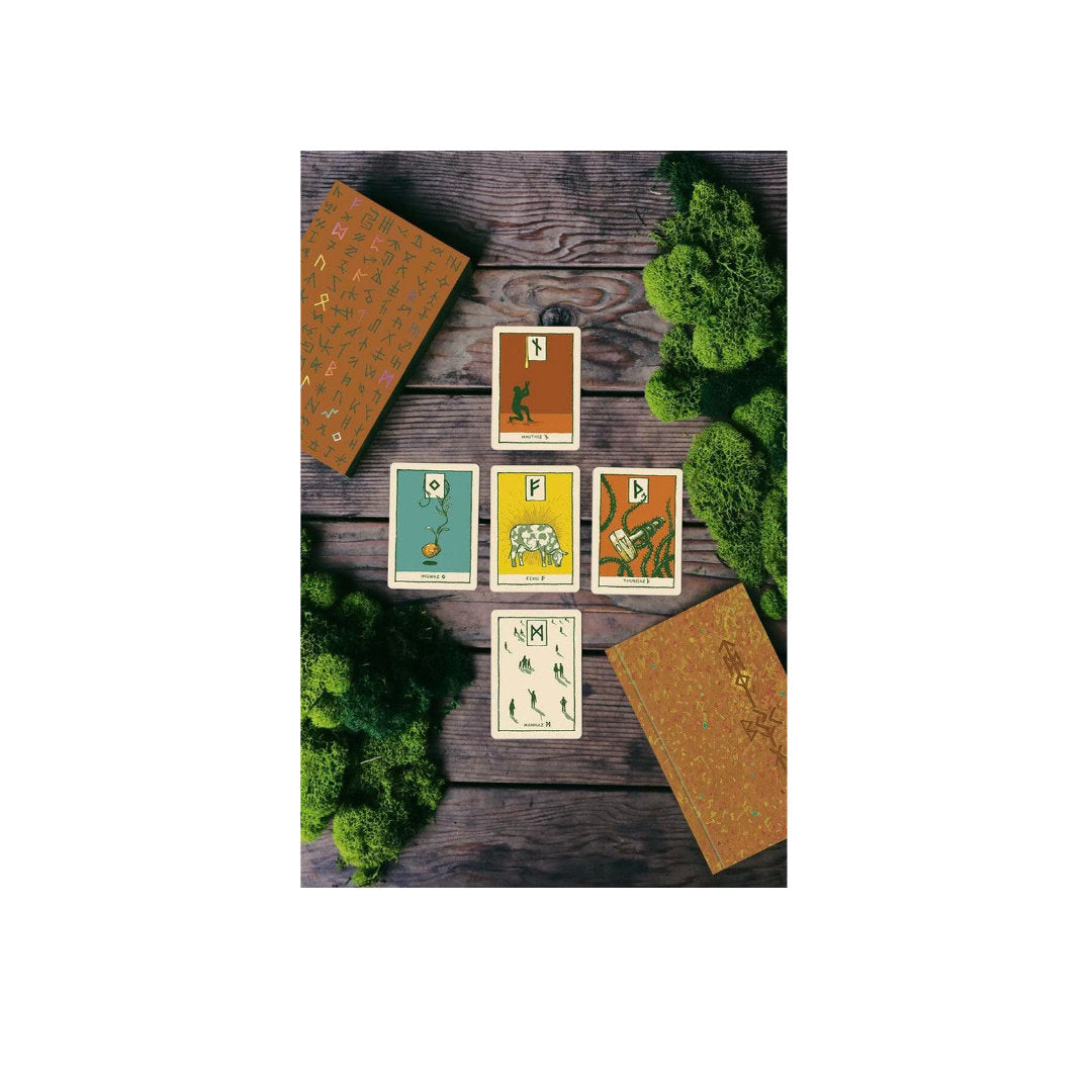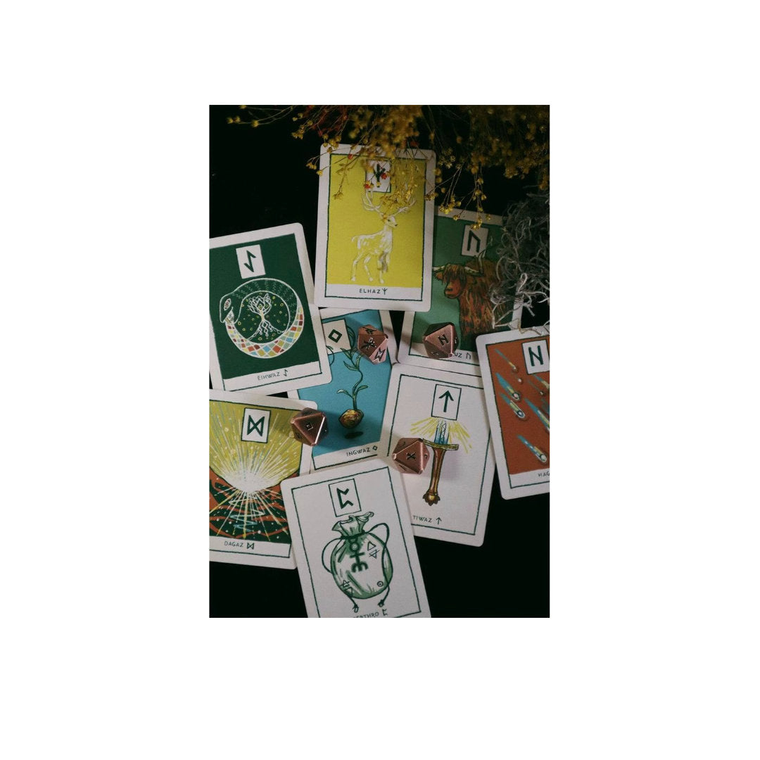 Esta baraja es la versión de James de las Runas Elder Futhark, uno de los primeros sistemas nórdicos de adivinación que existe desde hace milenios. Normalmente, las runas se encuentran en forma de piedras, dados, talismanes u otros objetos tallados. Cuando comenzó a aprender sobre las runas, le resultó difícil relacionar el símbolo nórdico con su significado. Para ayudarlo a comprender mejor los significados detrás de cada runa, creo esta baraja de cartas. Cada carta tiene un símbolo rúnico, el nombre tradicional y una imagen que abarca el significado detrás del símbolo. Lo útil de las runas Elder Futhark es que los significados son relativamente simples. Cada runa transmite un concepto o sentimiento que prevalecía hace miles de años y sigue siendo relevante hoy en día. Los dados incluidos proporcionan una forma alternativa de dibujar runas en una lectura.