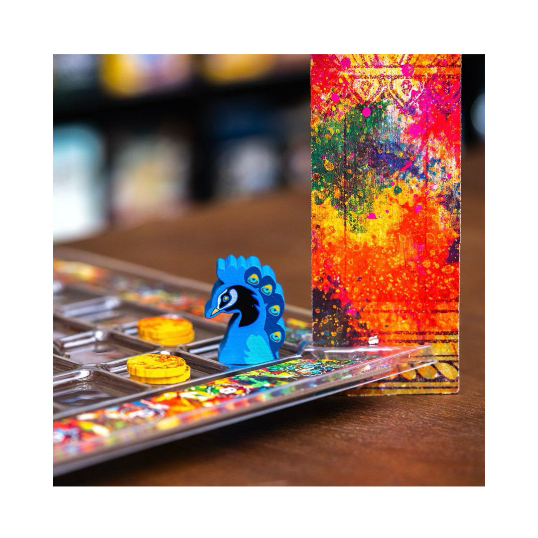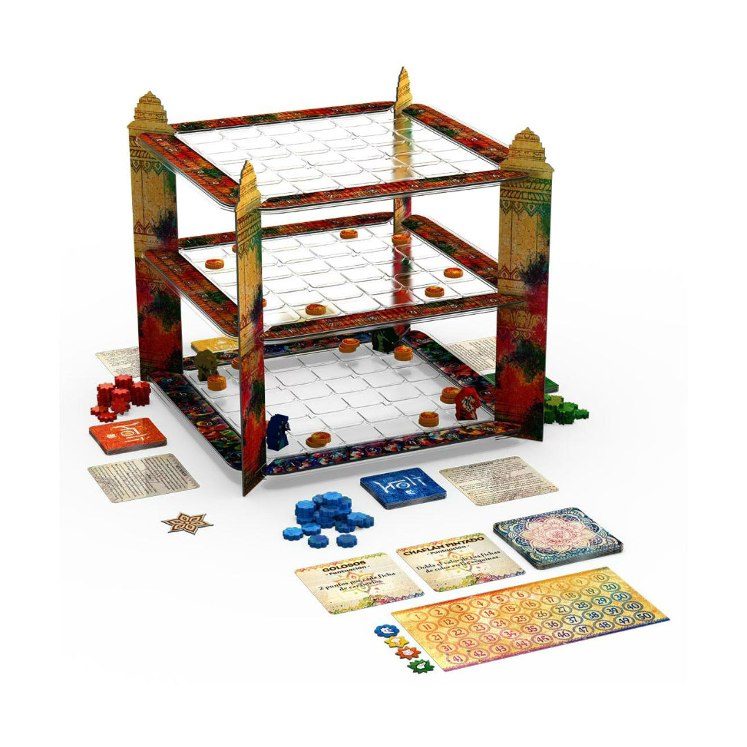 Holi: Festival de colores es un juego de mesa muy divertido que tiene como mecánica principal el control de áreas y la construcción de patrones. Uno de los principales elementos que destacan es un llamativo tablero de tres dimensiones, que representa tres plantas de casillas con seis filas y seis columnas. Tras este apartado visual simplemente espectacular se encuentra un juego en el que deberás desarrollar una estrategia bien elaborada para poder vencer a tus compañeros y rivales. Cada uno de los jugadores mueve un peón de su color y se irá desplazando por las plantas, intentando desplegar la mayor cantidad de fichas de su color. Cada uno de los jugadores irá capturando fichas de caramelos (hay una bonificación al final de la partida por haber recolectado el mayor número de caramelos) e intentando manchar con pintura a sus oponentes.