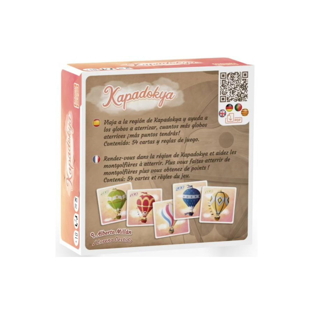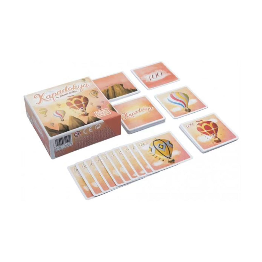 Kapadokya es una región de Turquía en la que todas las mañanas decenas de globos levantan el vuelo para contemplar los primeros rayos del sol. Una escena preciosa de la que formaremos parte con este juego competitivo para 2 jugadores. Cada jugador en su turno deberá colocar una carta en la zona de juego que representara un globo en un altitud indicada y si consigue un número indicado de globos conseguirá aterrizarlos y con esto puntos que le dará la victoria al finalizar la partida.