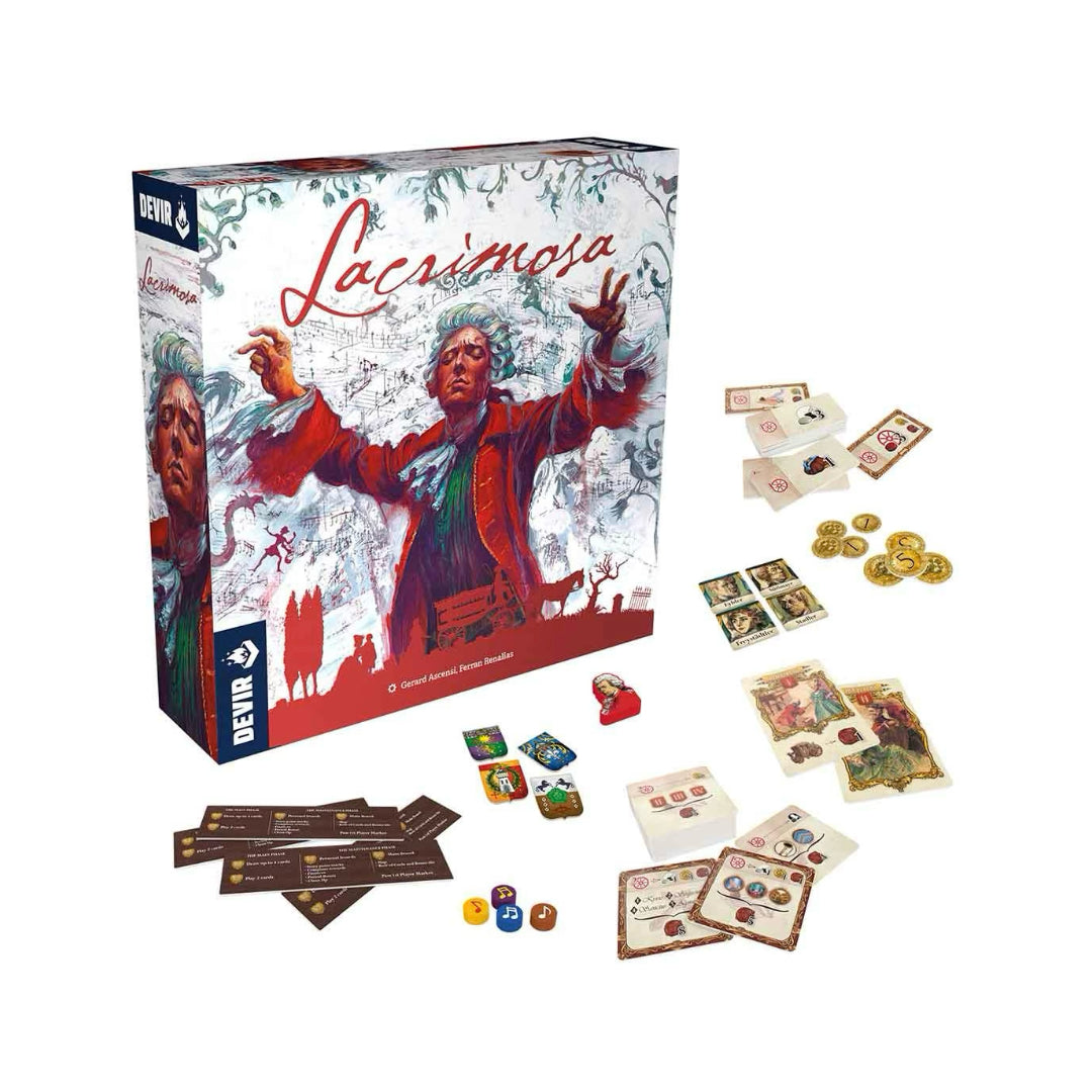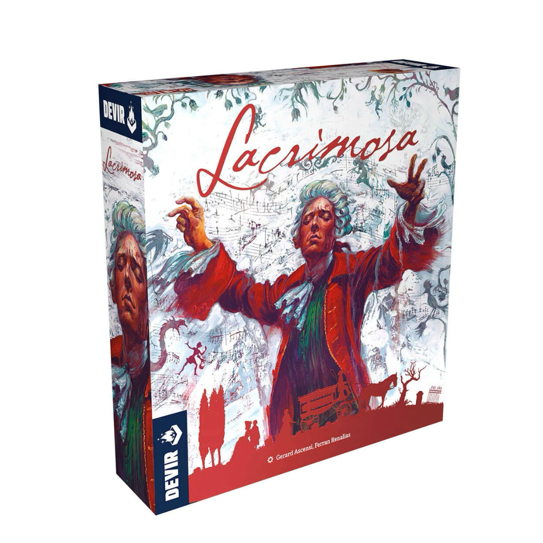 Lacrimosa se juega a lo largo de 5 rondas, que abarcan distintos momentos creativos de Mozart, en las que competirán por sumar el mayor número de puntos de reconocimiento. En su turno, encargarán obras al compositor, que podrán representar o vender; recordarán memorias compartidas y viajes por los escenarios más célebres del continente… Y, por supuesto, ayudaran a su viuda Constanze a terminar el Réquiem, que será recordado como su obra póstuma.