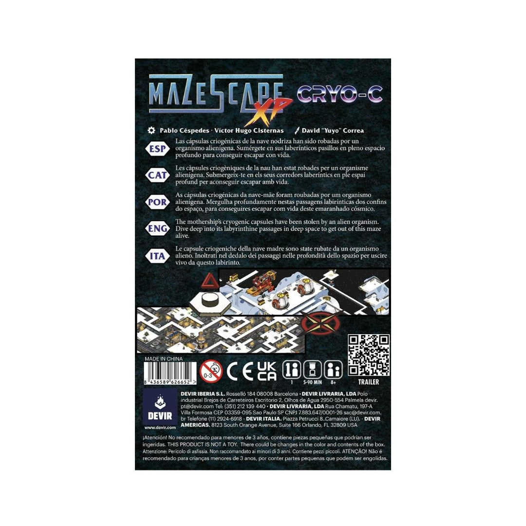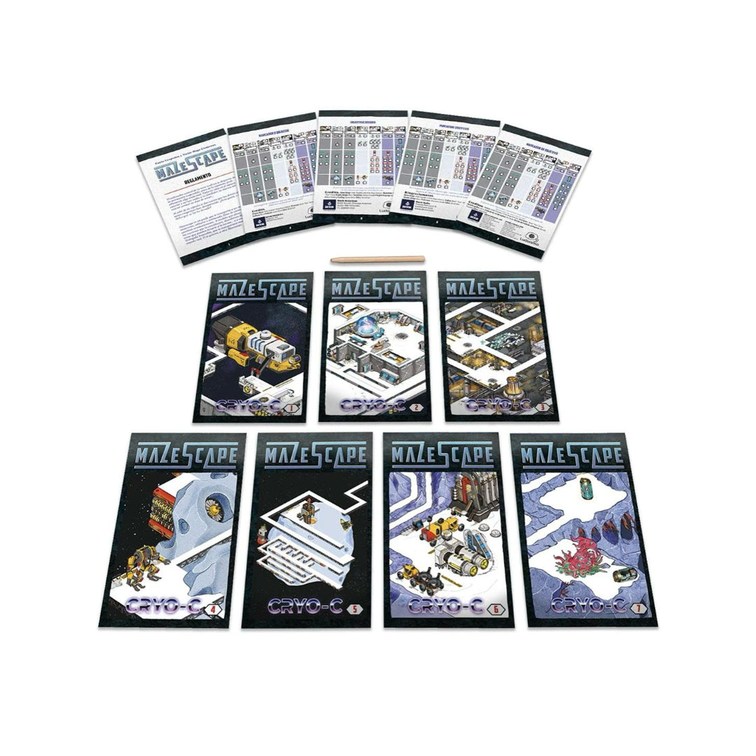 Los mapas incluyen toda una serie de objetivos secundarios que dan una segunda vida a los escenarios ya superados, ofreciendo de este modo una alta dosis de rejugabilidad. Tendrás que buscar todos los tesoros que se encuentran ocultos en los siete mapas de cada caja. ¡Nadie dijo que escapar del laberinto fuera una tarea sencilla! Y por si no fuera poco, su formato portátil lo hace ideal para llevarlo a cualquier lado; todo lo que necesitarás será desplegar uno de los siete mapas que incluye la caja y el puntero para seguir el camino. Mazescape Cryo-C supone un desafío avanzado en la saga Mazescape incluyendo los retos más complejos hasta la fecha. ¿Te atreves a probarlo?