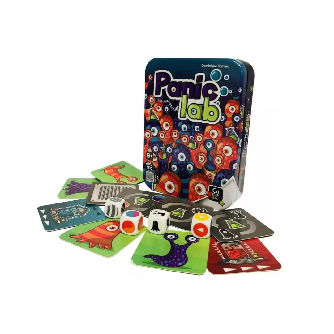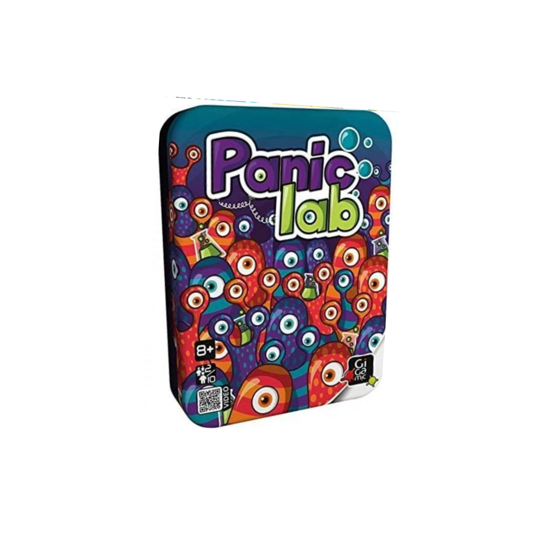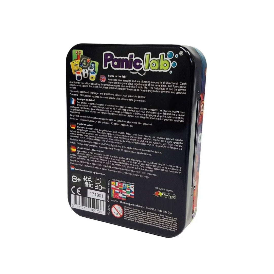 Panic Lab es un juego de mesa en el que tenemos que cuidar nuestro preciado laboratorio de la fuga de unas amebas. ¡Las amebas se escaparon y están moviéndose para todos lados! ¡Encontalas rápido! En este juego, todos juegan juntos y al mismo tiempo. Tirá el dado que te indicará de qué laboratorio escapó la ameba y como es la ameba escapista. El primer jugador en encontrar la ameba correcta ganará un punto. Pero cuidado, ¡estos pequeños embaucadores no quieren ser atrapados! Un juego rápido, de reglas simples para desafiar a los más atentos.