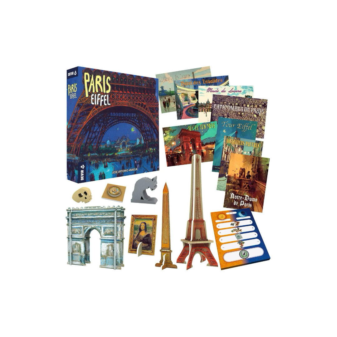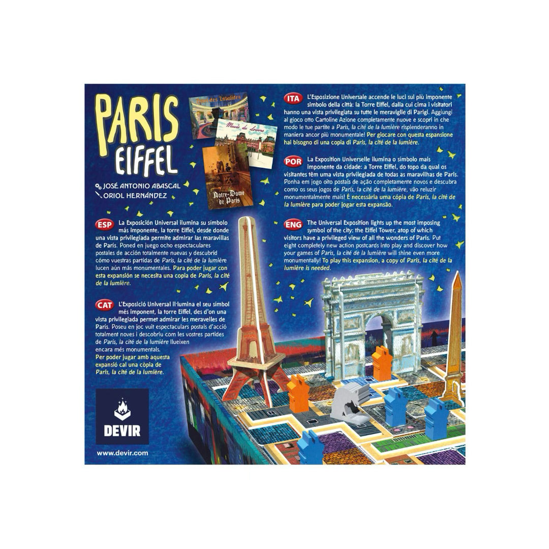 Paris Eiffel es una expansión de Paris: La cité de la lumière, de modo que es necesario tener una copia del juego básico para poder jugar con esta. Aquí encontraremos ocho nuevas postales de acción que nos ofrecerán muchísima variabilidad a nuestras partidas. Las postales se acompañan de una serie de figuras troqueladas que le van a dar una espectacular luz tridimensional a Paris. Además, por petición popular, incluye una libreta para ayudarte a contar los puntos de las partidas de París. En esta expansión visitaremos maravillas parisinas como el arco de triunfo, el obelisco de Luxor, el Museo del Louvre y, evidentemente, la torre Eiffel.