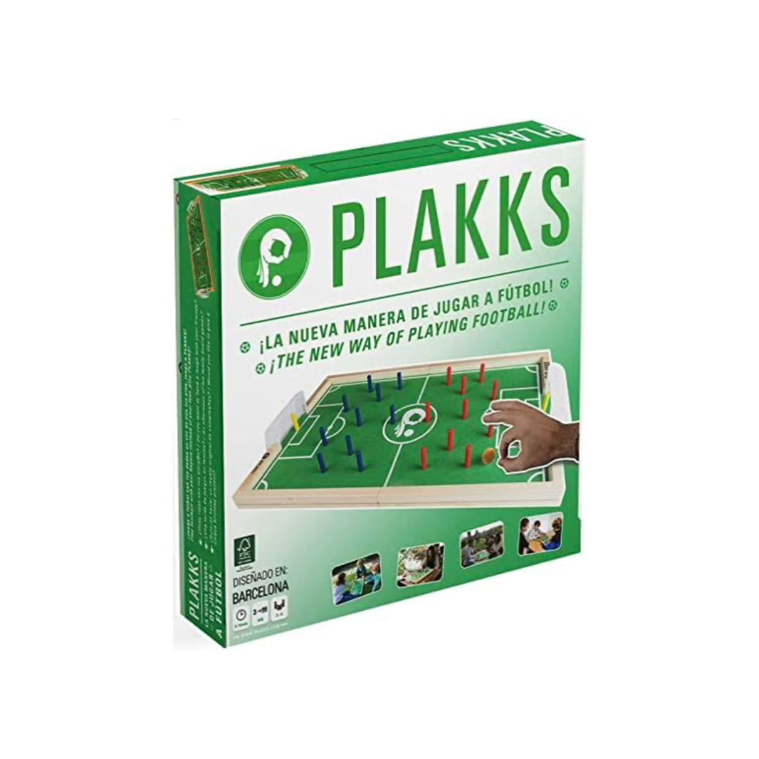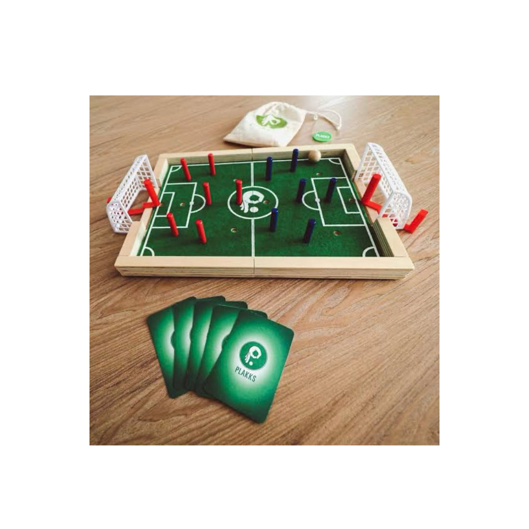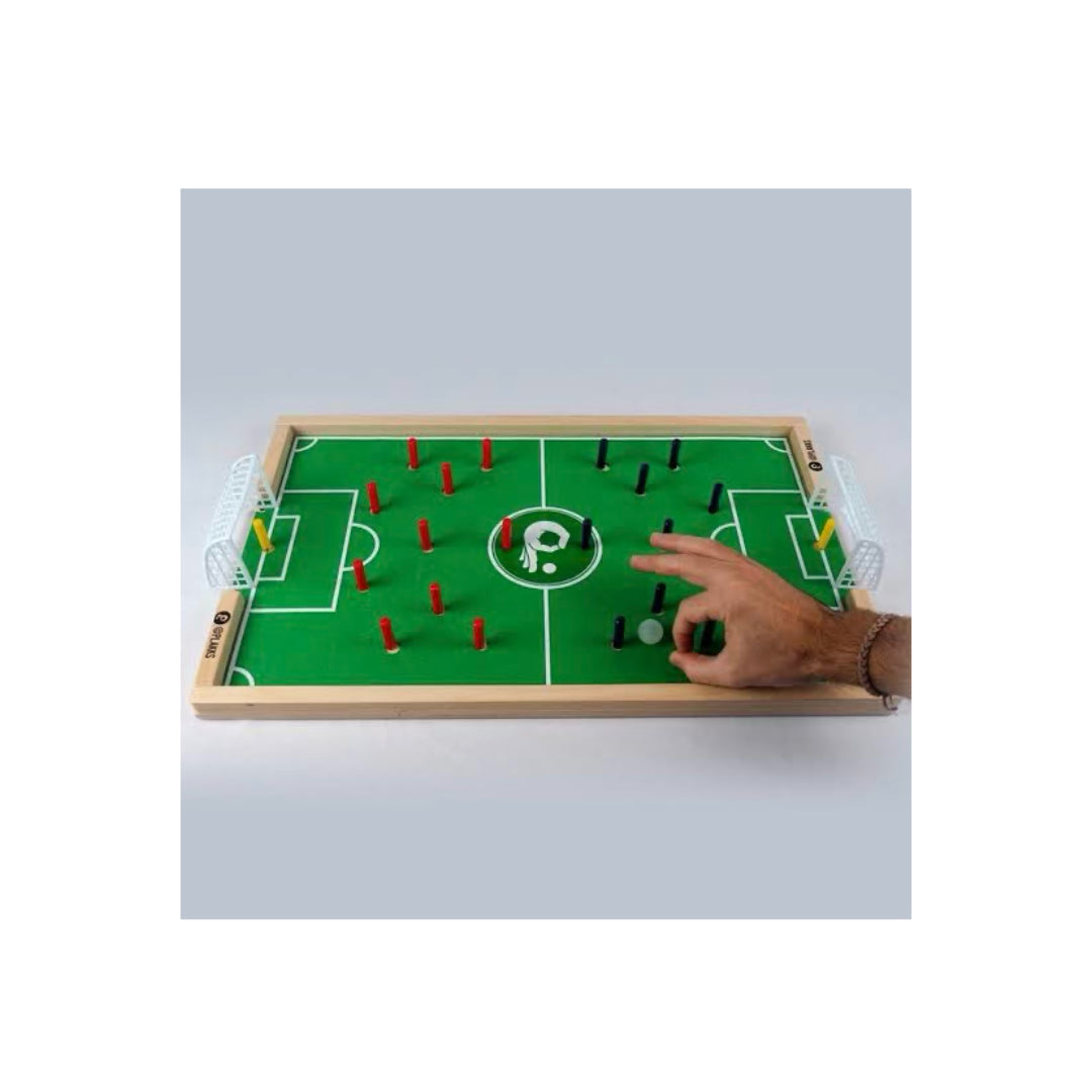 Pequeño futbolín de madera, para jugar en cualquier mesa o en el mismo suelo, donde el objetivo es marcar en la portería contraria golpeando la pelota con el dedo. Cada rival tiene un tiro, y así sucesivamente. Cuando marcas gol, el rival tiene que eliminar/quitar uno de sus once ‘palitos’ del tablero. Quien se quede sin palitos ¡pierde! ¿Con QUIÉN jugar? Con quien quieras, porque es un juego para todas las edades! Niños, adolescentes, jóvenes, adultos y ancianos. Partidas rápidas de 5-10 minutos. Para jugar 1 VS 1 o también 2 VS 2. Muy fácil de aprender y jugar.