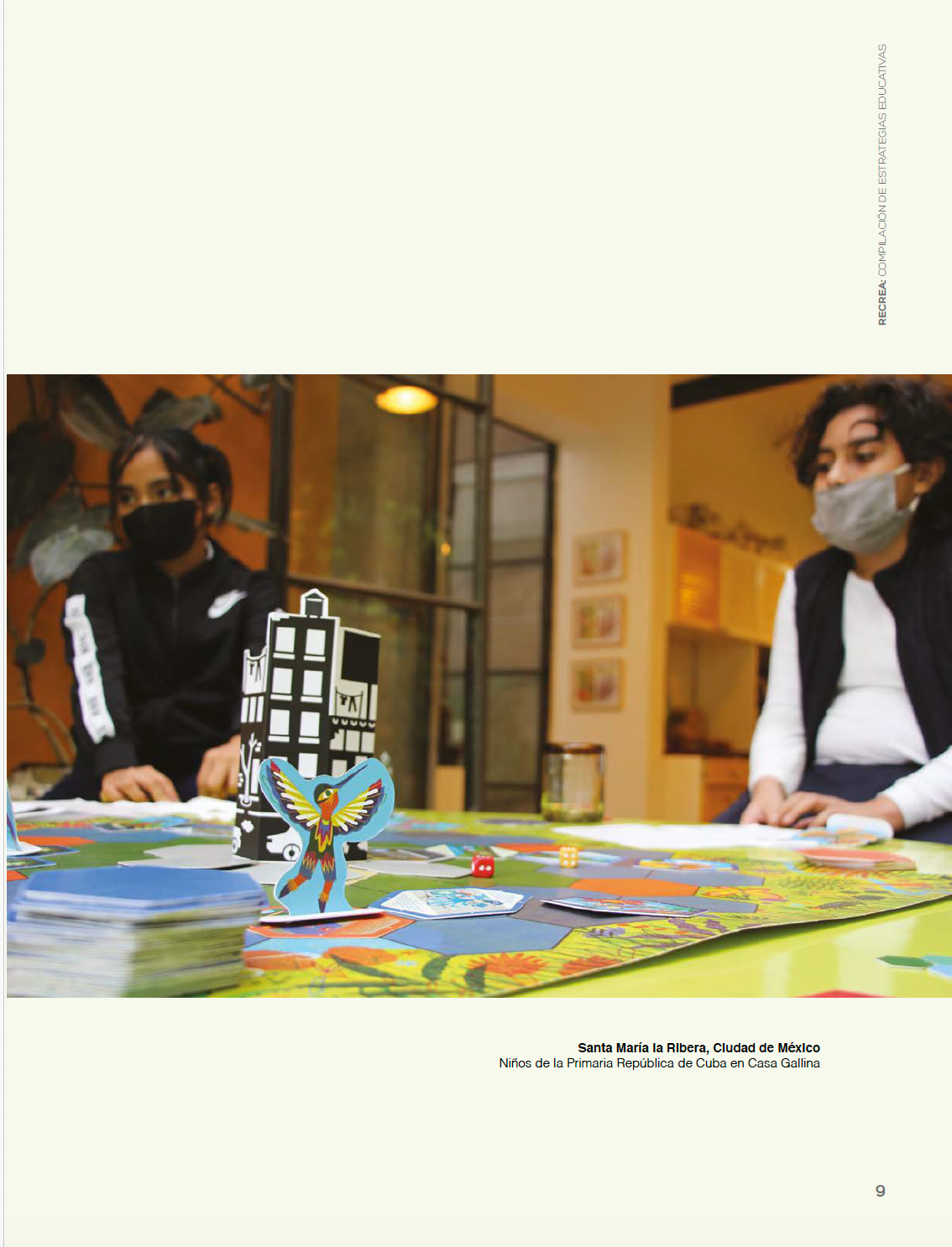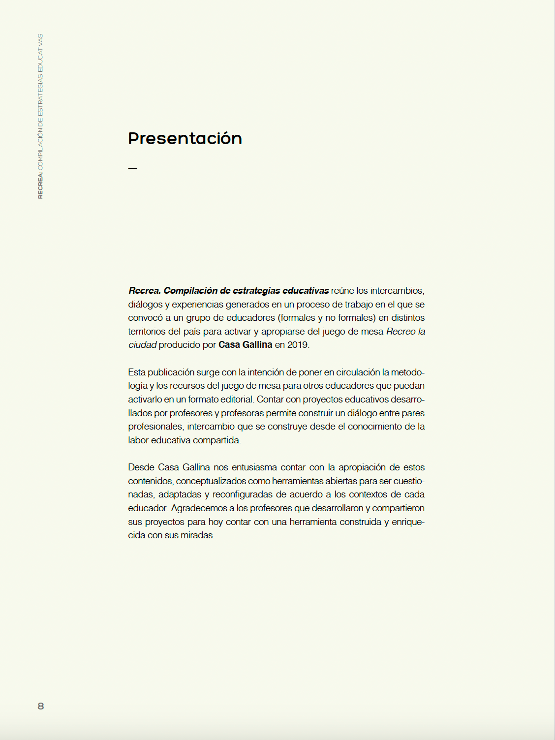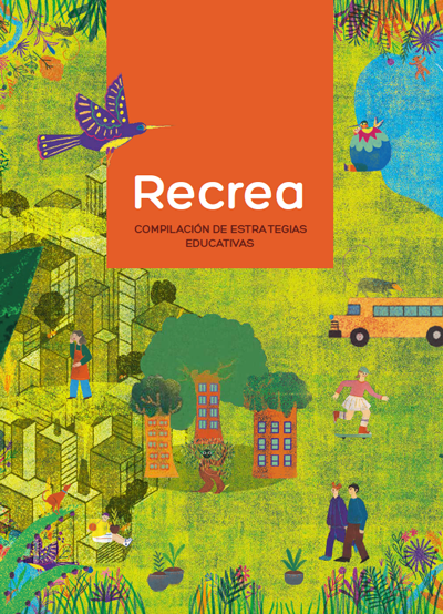 Recrea. Compilación de estrategias educativas reúne los intercambios, diálogos y experiencias generados en un proceso de trabajo en el que se convocó a un grupo de educadores (formales y no formales) en distintos territorios del país para activar y apropiarse del juego de mesa Recreo la ciudad producido por Casa Gallina en 2019.