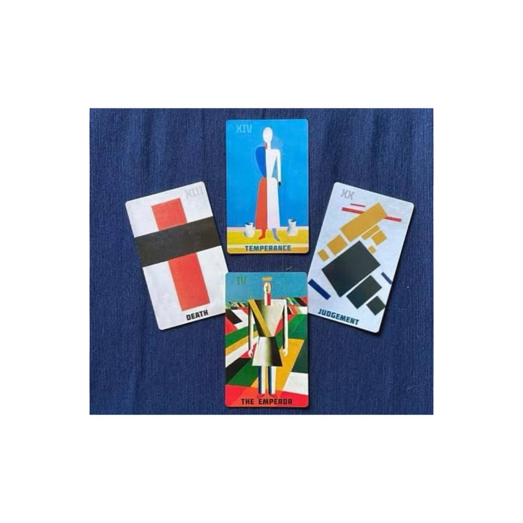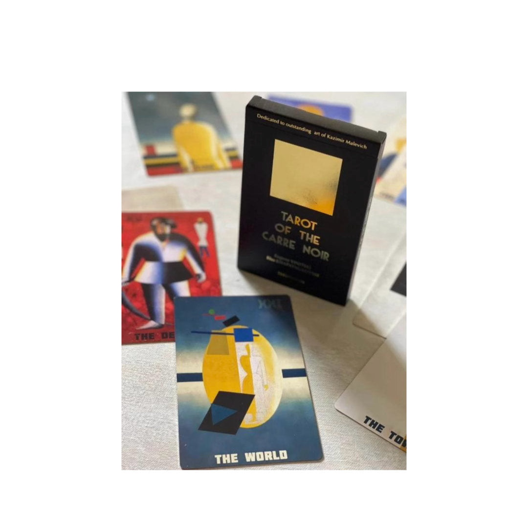 Carl Gustav Jung escribió que el color y la forma son los dos conceptos que permiten comunicarse directamente con su inconsciente. Esta idea se convirtió en la base del Tarot Carré Noir. Se inspiró en las obras de Kazimir Malevich, el creador del suprematismo, un movimiento artístico único y revolucionario del siglo XX. Este estilo de artes visuales enfatizaba el color y la forma como formas supremas de representar la realidad., Así, los Arcanos del Tarot Carré Noir, arraigados en composiciones suprematistas y figurativas, se apartan en su iconografía de la cosidad tradicional. Permiten extraer de cada símbolo y de cada imagen una emoción pura y un vector que facilita lecturas del Tarot vívidas y polifacéticas.